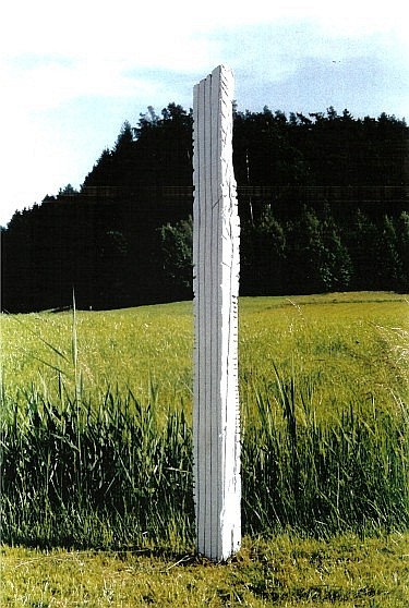 es aus der Gegenständlichkeit in die Abstraktion zu bringen. Alles Überflüssige wird entfernt, bis das Wesentliche erscheint. Die Objekte bleiben naturbelassen oder werden farbig gestaltet aufgestellt. Die Motorsäge benutze ich als Werkzeug, als Gestalter und Wandler des Holzes. Die Blöcke werden aufgerissen, zeigen Verletzungen, Risse, Kreuzungen längs und quer. Überall entstehen Aufbrüche, Löcher, Furchen, tiefe Wunden. Das Erforschen des Materials treibt mich dazu, ins Innere zu gehen. Die Skulpturen stehen da als Ruhepol für die schweifenden Gedanken und als Ausdruck von Kraft und Spontaneität. Meinem Charakter entsprechend, sind sie aus der Intuition heraus geschaffen, nicht mühsam konstruiert. Nein, die Zeichen werden spontan eingesetzt, schnell und zum Teil aggressiv. Die Skulpturen sind Wächter oder Mahnmal, ob sie nun einzeln oder als Gruppe in freier Natur oder im Raum stehen. 15.3.2000 Manfred Zacher |